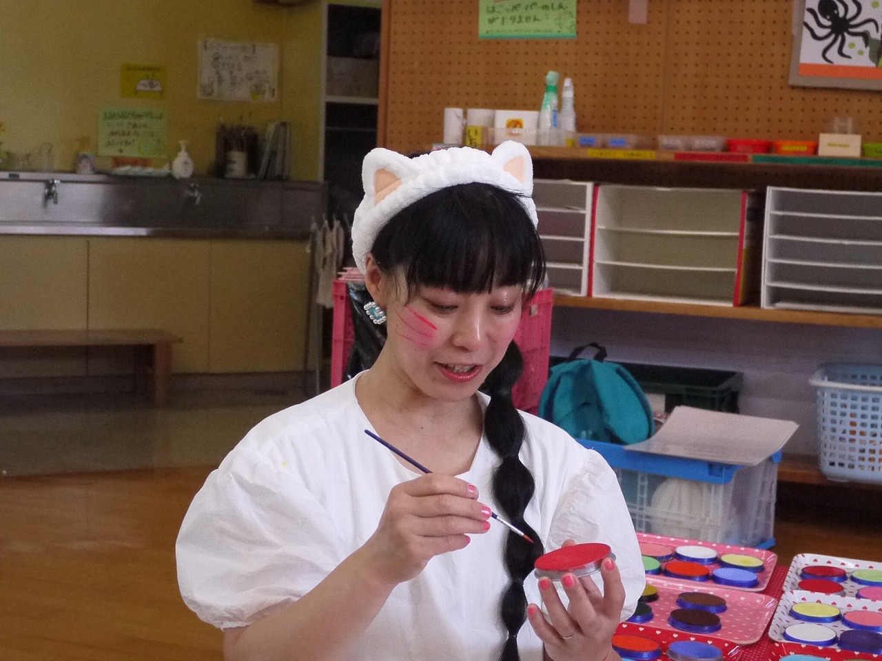 先にKana先生が自らお顔にペイントをしてお手本を見せてくれたのですが、パフでほっぺにポンポン色をのせたり、筆でおひげやハートを描いていて、とてもお似合いでした♪