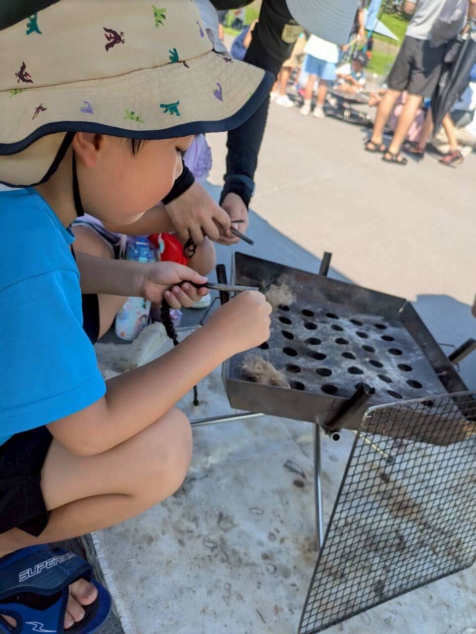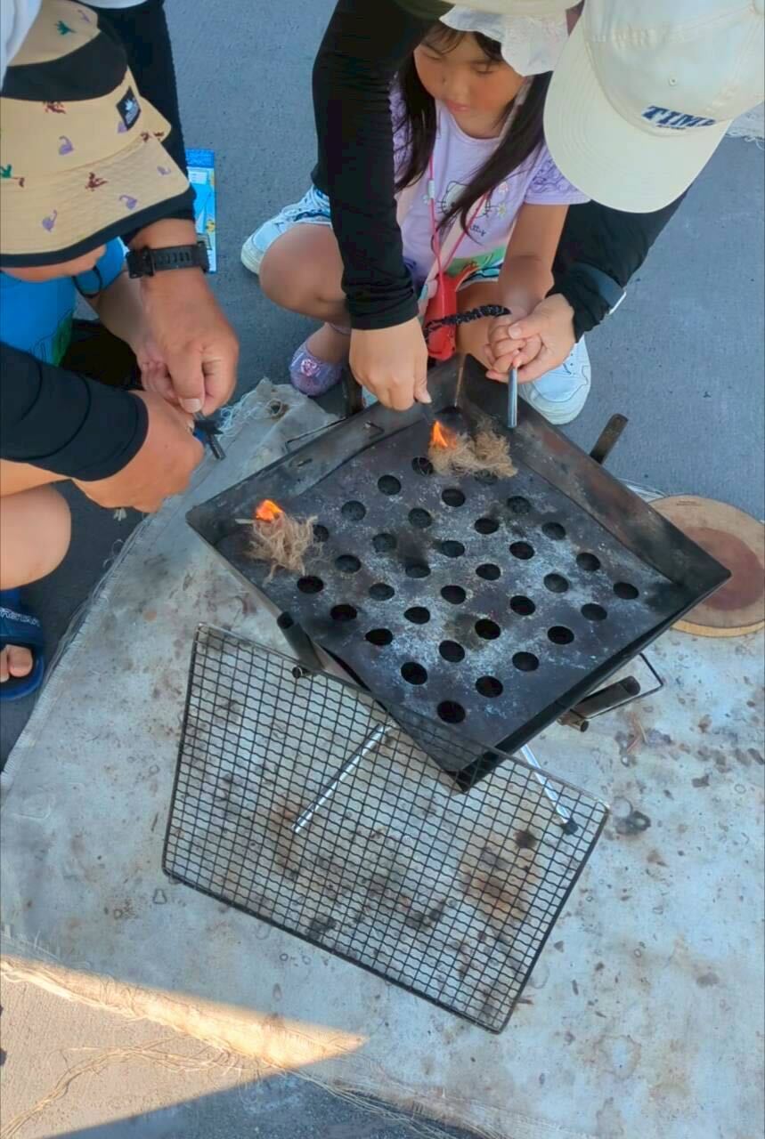 スタッフの方に教えてもらいながら火打ち石を使って火をつけます。最初はなかなか火がつかず苦戦しましたが、スタッフの方と一緒にやってみると少しずつ火花が散り…火がついた瞬間は大興奮!