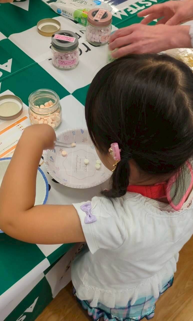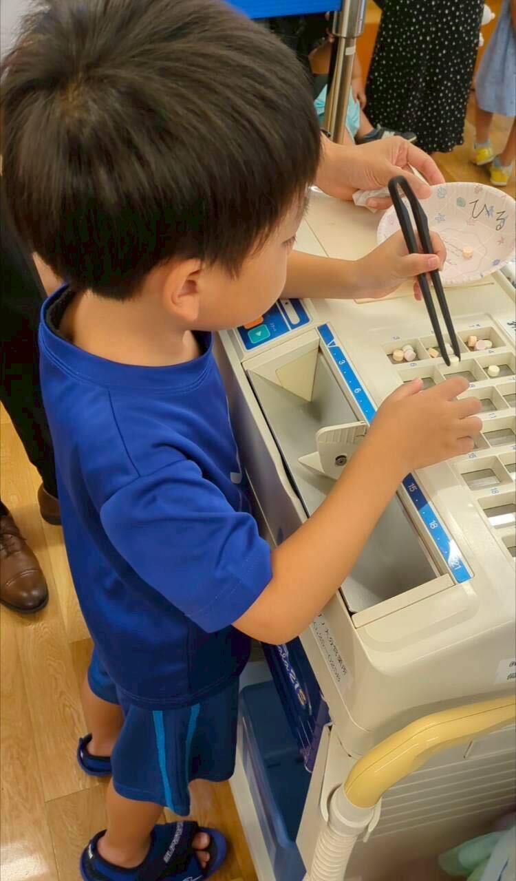 さらに薬剤師のお仕事体験もしました。錠剤に見立てたラムネをピンセットで取って朝昼晩3日分作ります。朝はこの味とこの味…と決まっているのでなかなか本格的。2人とも真剣になって挑戦していました。