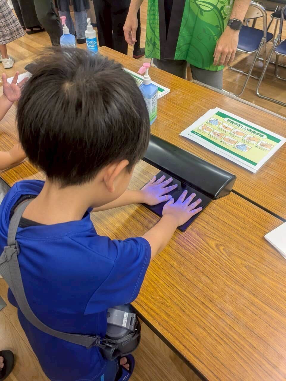 まずは手洗いチェック。いつも通り手を洗ったあと、特殊なライトを当ててどれくらい手がきれいになったかチェック!