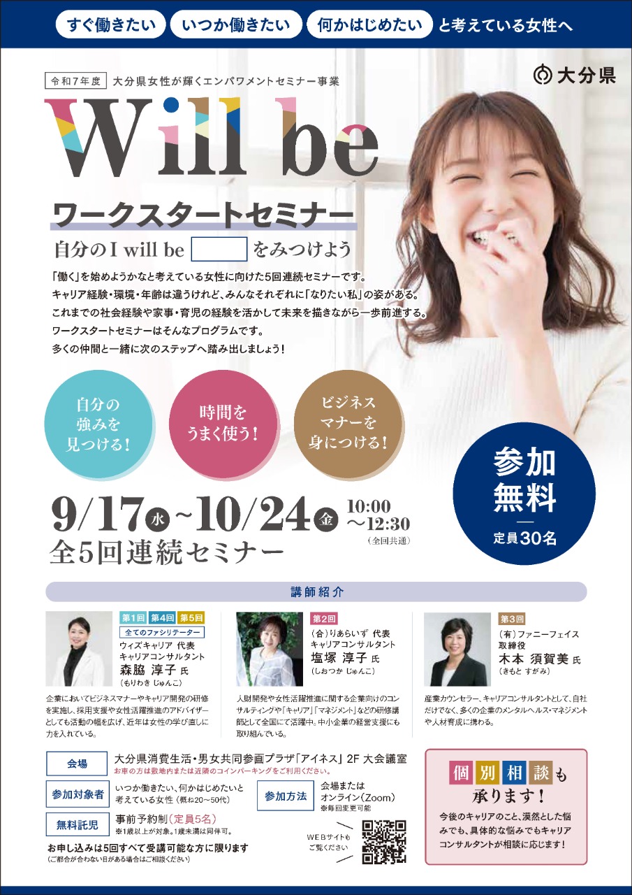 「働く」を始めようかなと考えている女性に向けた5回連続セミナー。これまでの社会経験や家事・育児経験は立派なキャリとなり、その経験を今後のキャリアを活かしながら働くために、必要な時間管理術やビジネススキルなどを学ぶ内容。また4回目にはさまざまな選択をした女性たちの経験談を聞く機会などもあり、選択肢を広げるきっかけにも。「なりたい自分」に向かって多くの仲間と一緒に次のステップへ踏み出すチャンスです!