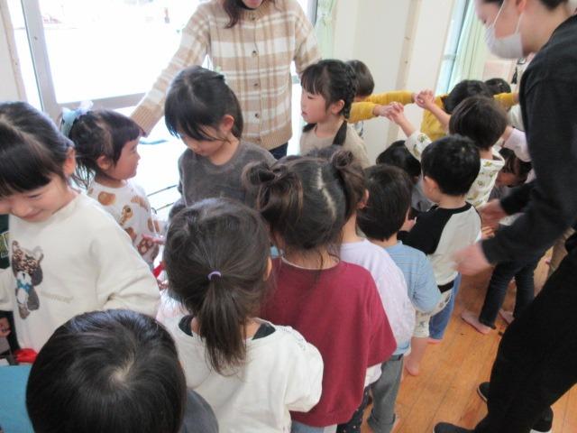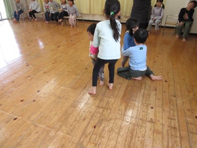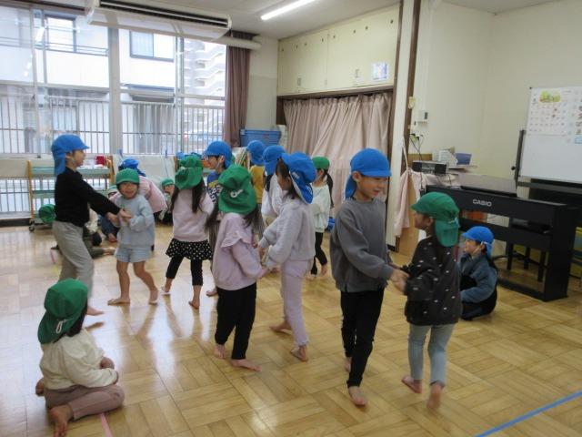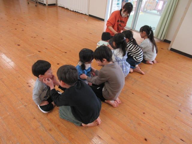 きりん組(3,4歳児)はカッパフレンズという2人組で遊ぶ、ふれあい遊びをしました。