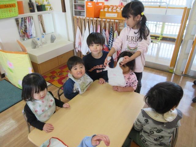 りす組(1歳児)は、おやつの時間にお手伝いに来てくれました。