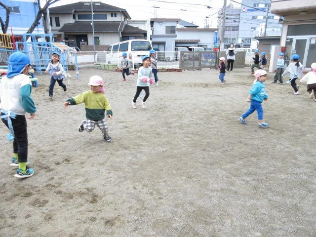 うさぎぐみ、ぱんだぐみ(2歳児)はしっぽ取りを一緒にしました。