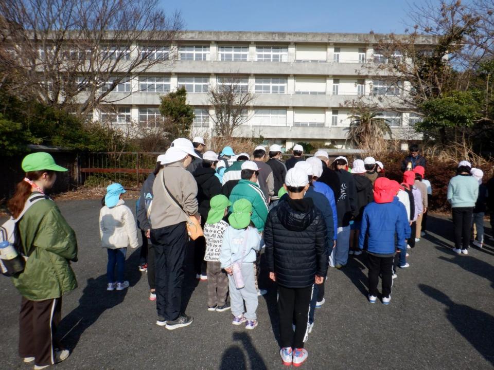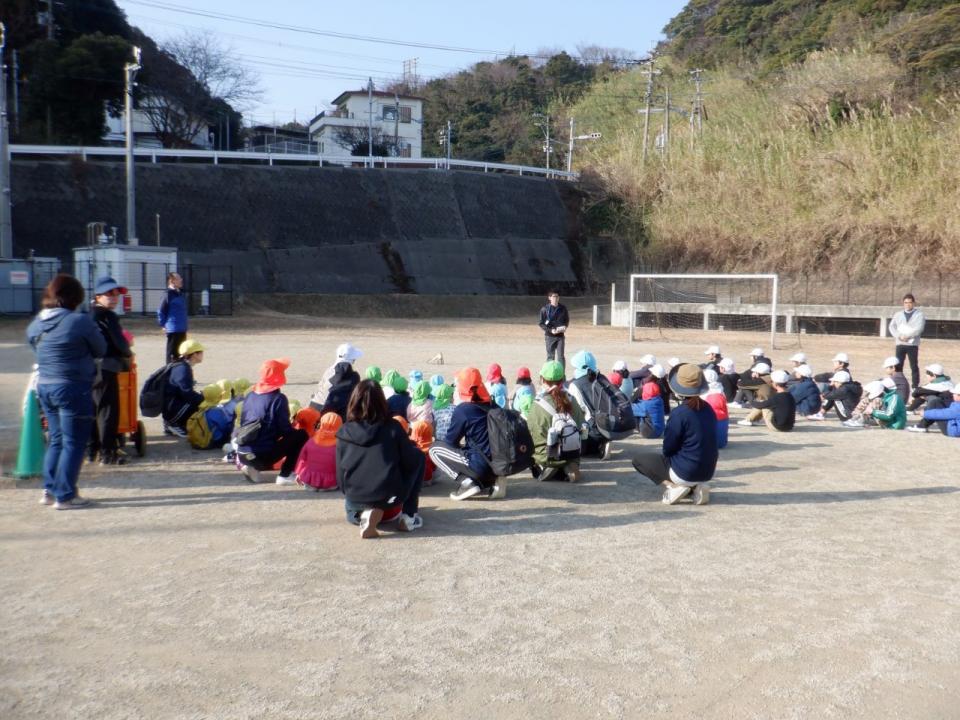 小学校の校庭までまずは全員で避難しました。小学校の先生の話をよく聞いています。