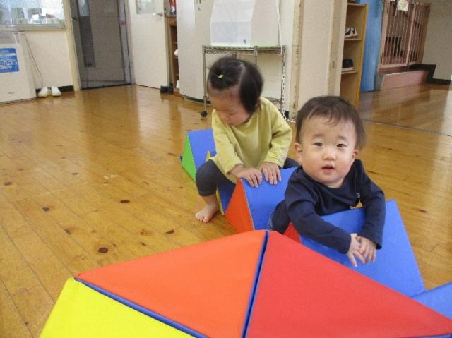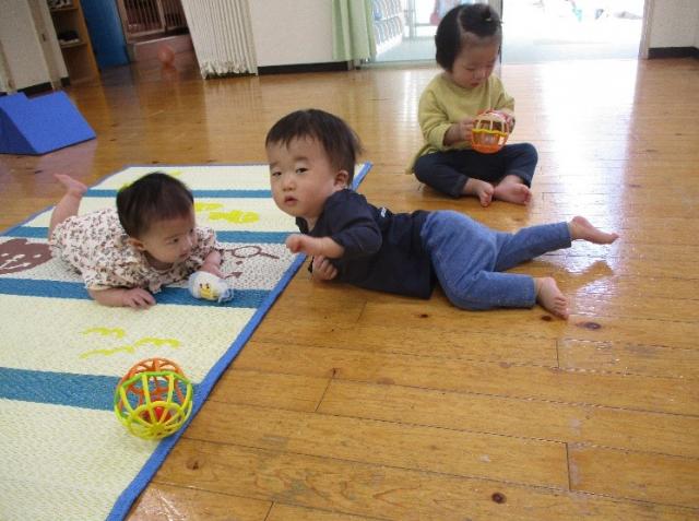 ひよこぐみ(0歳児)は園内遠足。広いホールでたくさん体を動かして遊びました。
