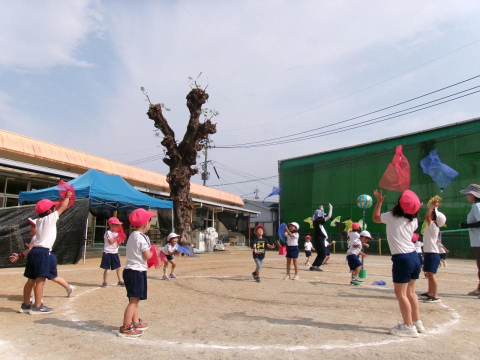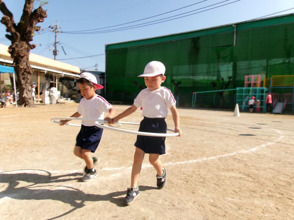 らいおん組さんは友だちと力を合わせてフープ競争