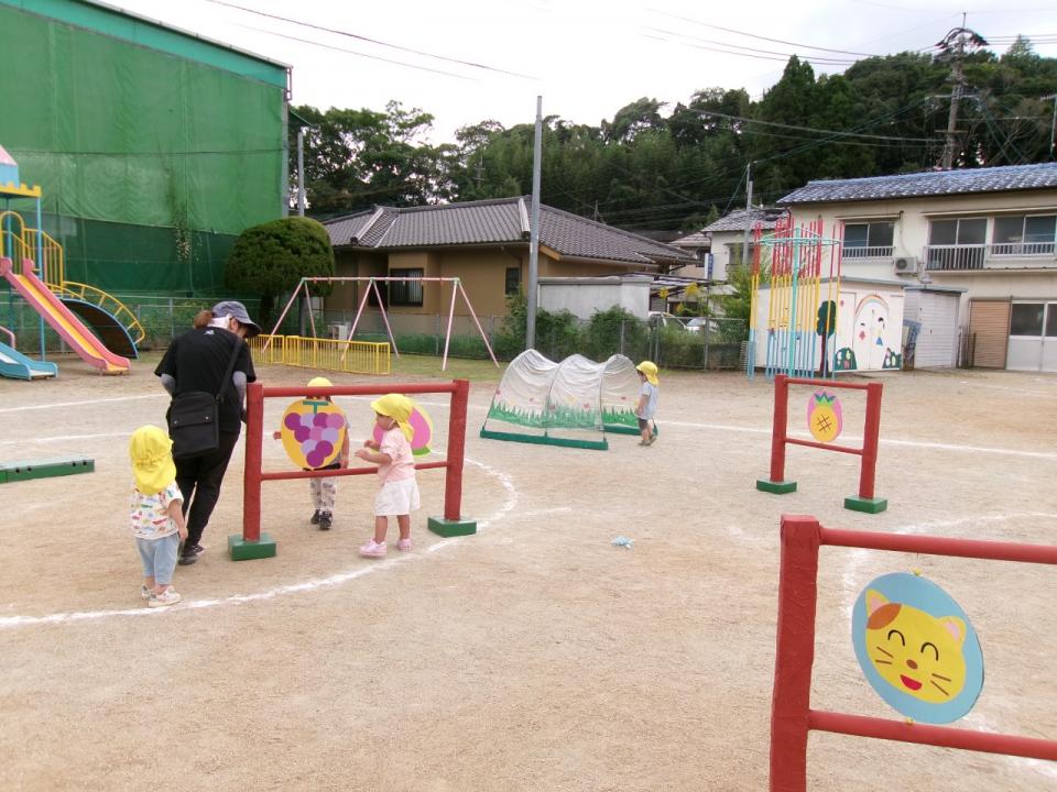 りす組さんは、保育者と一緒にトンネルをくぐったり、