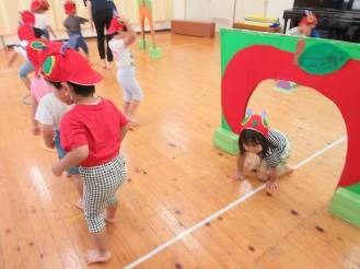 ぱんだ組さんは大好きな絵本「はらぺこあおむし」のあおむしになって遊んだよ。