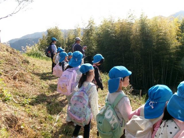 就学を控えた5歳児のこどもたちが、河原内の里山探検に行ってきました。今回は、浜町保育所と住吉保育所の5歳児さんと一緒です。“里山”ってどんなところかな?と、わくわくしてバスに乗ること1時間。やっと到着したところは、木々に囲まれた自然あふれる場所でした。