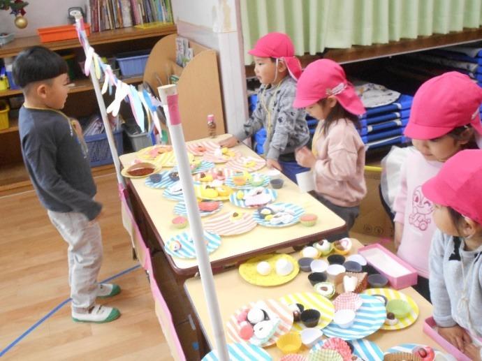 らいおん組さんの遊びを見て『うさぎ組もお店やさんしたい!』と保育参観でお家の人と一緒に作ったお菓子を使っておかし屋さんオープン!