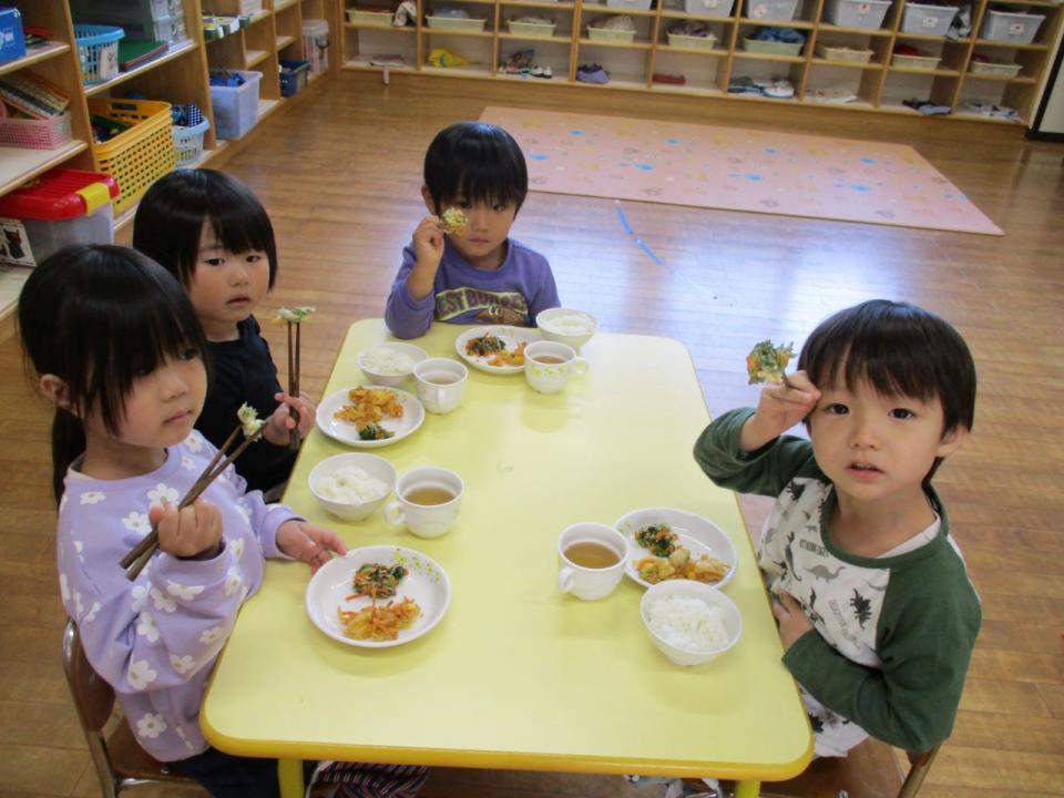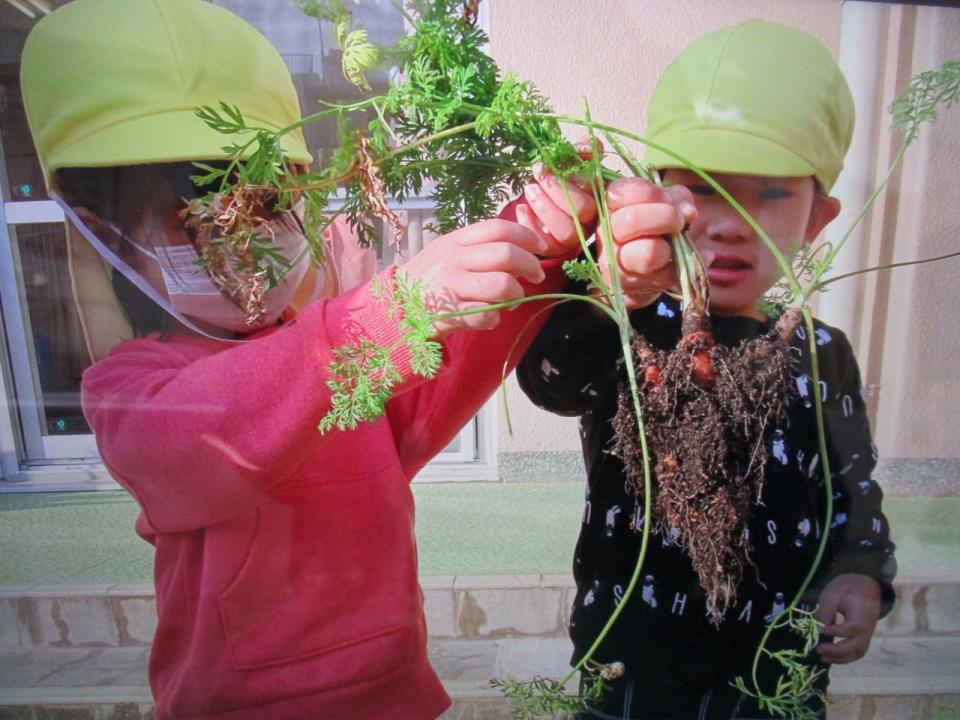 「おいしい!」「はっぱもおいしい」「葉っぱもたべれる!」などの声が聞こえました。日ごろ、にんじんが少し苦手なこどもも笑顔で食べていました。自分たちで育てて、収穫して、最後に味わうところまで経験し、いろんなことを感じたとったこどもたちです。ハーブのような香りのにんじんの葉のおいしさも知りました。