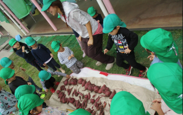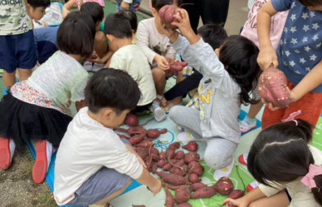 園に持って帰り、「まるいおいも!」「かぼちゃみたいなかたち~」と触ってみました。「ちいさいね」「おおきい」と大きさを比べてみたり、「何個あるかな?」と並べて数えたりしました。