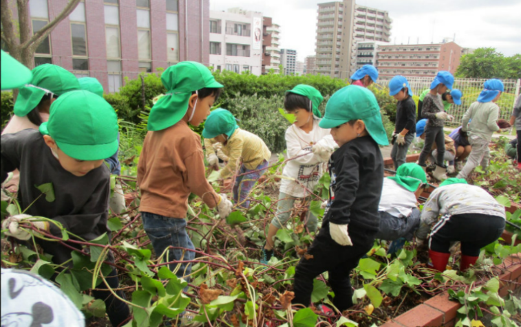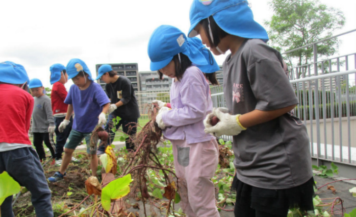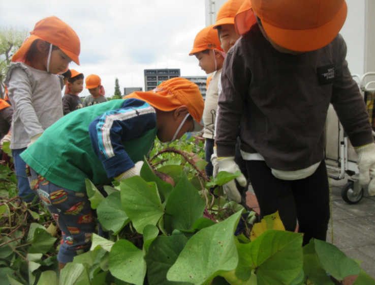 5月にホルトホールの庭園に植えたおいも。「おいも、おおきくなったかな?」とワクワクして、みんなで芋ほりに行きました。
