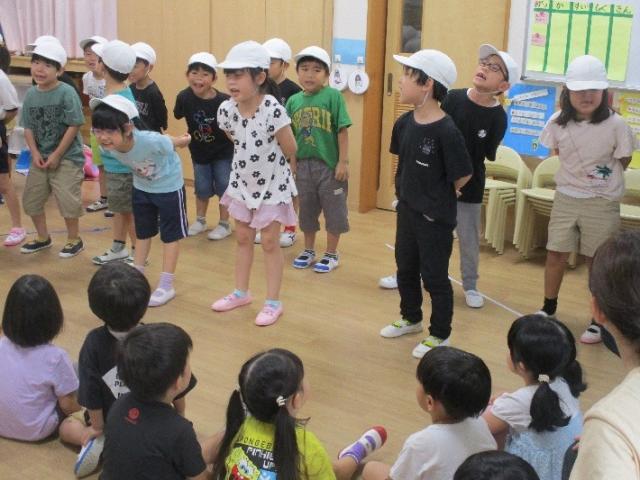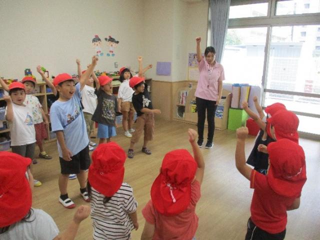 運動会に向けて、年長児は「みんなが頑張れるように応援をしたい!」と、応援団を結成しました。そして、3、4歳児は「一緒にしたい!」ということで、応援団にかけ声を教えてもらいました。年長児さんの迫力あるかけ声に力をもらい、3、4歳児も段々と大きな声が出るようになってきました♪