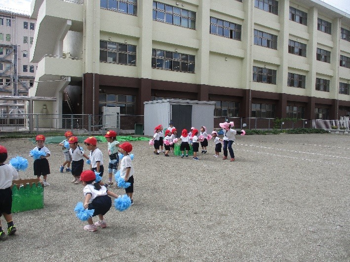 3歳児は色鮮やかなポンポンを持って踊ります。保育者や友だちを見て振付を覚えながら、曲のリズムに合わせて楽しそうにポンポンを動かしています♪