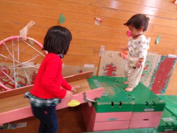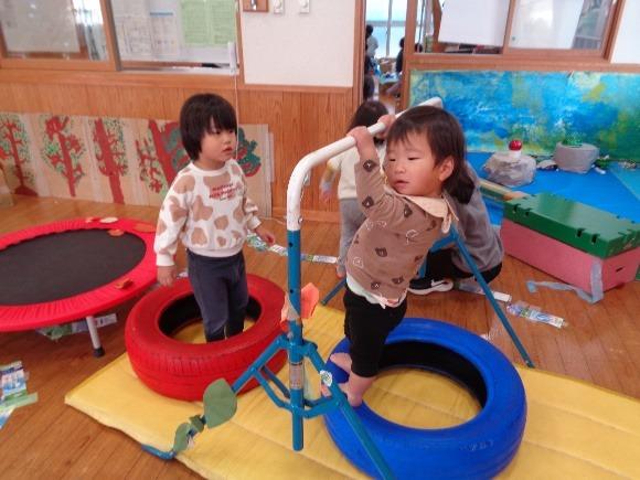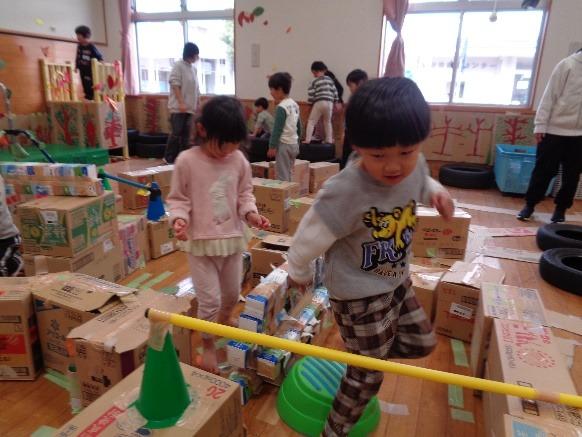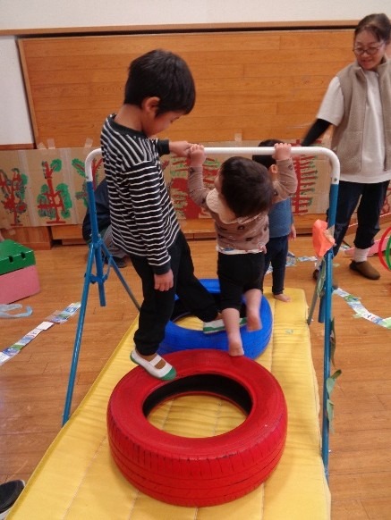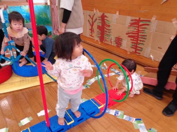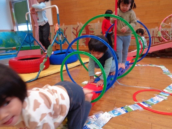 大きさの違うフープのトンネル、鉄棒、タイヤの階段など、毎日いろんな遊具を並べ替えて森の道を作りました。大人気でした。