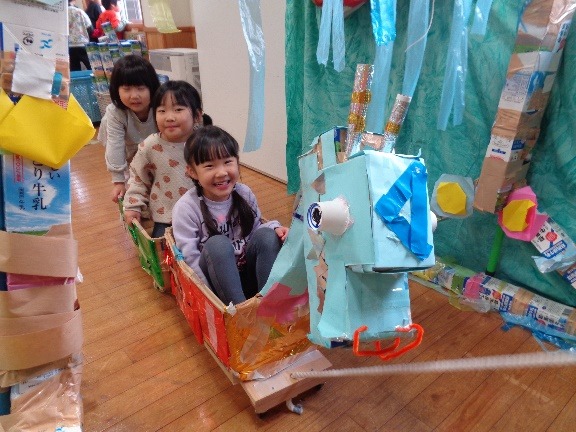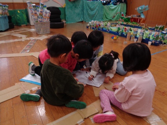 たんけんたいの森には「クモの巣」「森の道」「りゅうの家」「りゅうじんの池」の4つのコーナーがあります。らいおん組がどんなコーナーにしたいか考え、話し合い、作って、遊んでみるを繰り返し、完成しました。らいおん組がたくさん遊んだ後は小さいクラスの友だちを招待しました。
