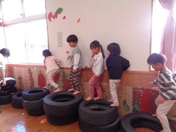 タイヤは不安定でちょっと怖いけどおもしろい。年中クラスのきりん組もバランスを取りながら歩いています。全身運動で体幹が強くなりますね。