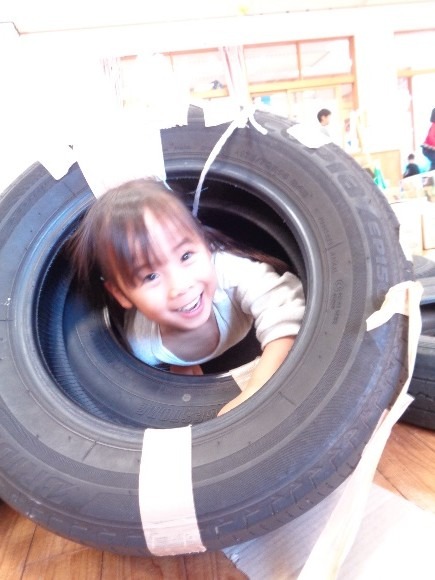タイヤをつなげて作ったトンネル。狭い穴の中を手や足、全身を使って通るのも面白い!!タイヤの上にも乗れていろんな遊びができました。