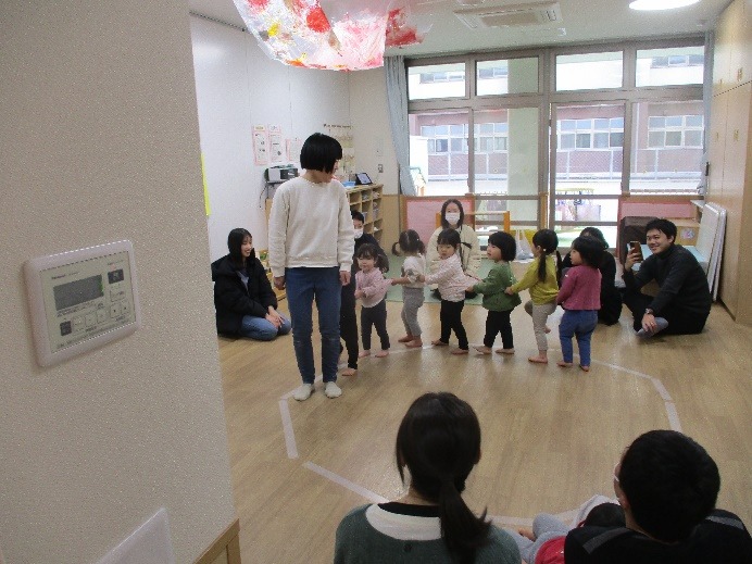 1歳児クラスは、日頃遊んでいるわらべうた遊びを、おうちの方に見てもらいました。歌に合わせて順番に友だちが増えていくのですが、上手に繋がって歩いていました♪