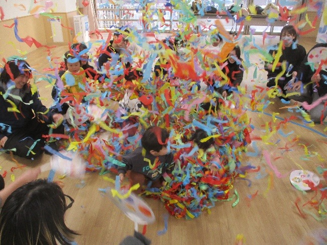 1・2歳児のくらすは、同じ紙でも、色がついていて感触が柔らかい花紙で遊びました。量がたくさんあることで、自分で紙を抱えたり、紙の中に埋もれたりと、全身で遊びを楽しんでいます。
