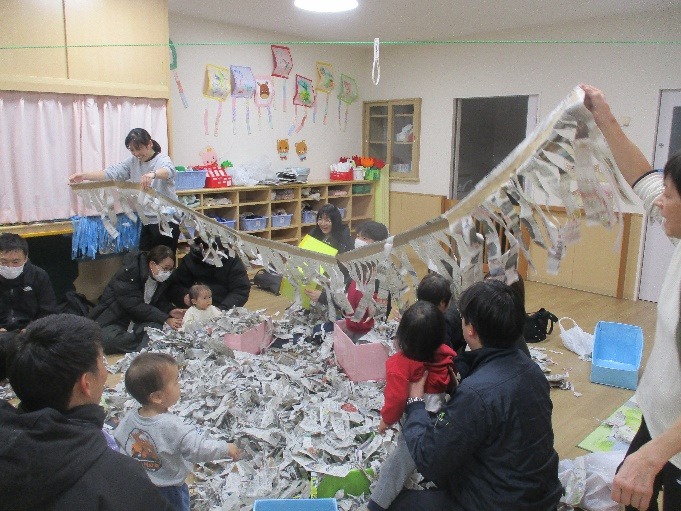 おうちの人に新聞紙をたくさんかけてもらって、こどもたちは紙の動きを目で追ったり、紙が降ってくる感触を楽しんだりしていました。