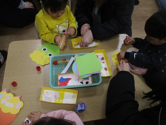 2歳児クラスは、遊びの中に取り入れ始めた、はさみやのりを使った遊びを見てもらおうと、季節に合った節分の鬼のお面作りをしました。顔の形、目や口などは自分の好きな形を選び、集中して作っていました。