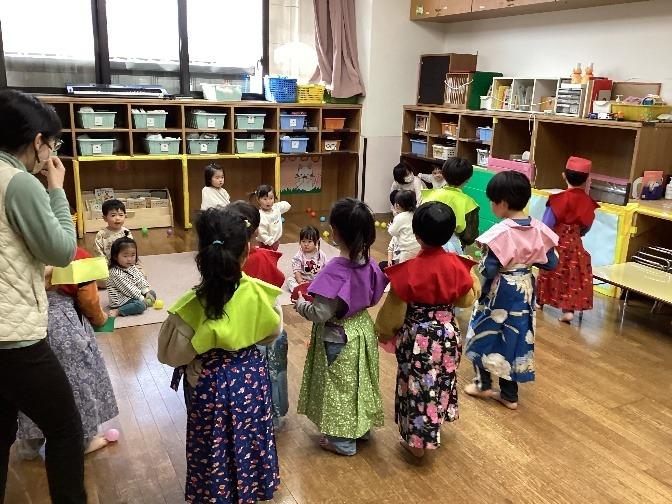 らいおん組の5歳児が、裃を着て、「鬼はいないかー!?」と各クラスのお部屋を回って、豆まきをして鬼を追い出してくれました。
