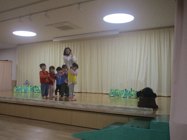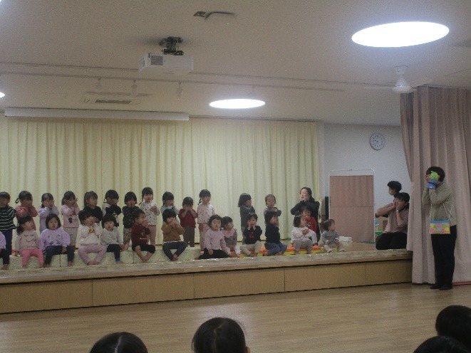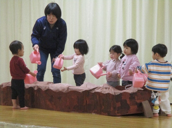 2歳児みかん組さんは、「おむすびころりん」をもとにしたお話ごっこで遊んでいます。1年間で楽しんできた遊びを組み込んだお話になっていいますが、簡単なルールの追いかけ遊びはお気に入りで、おに役を交代しながら遊んでいます。