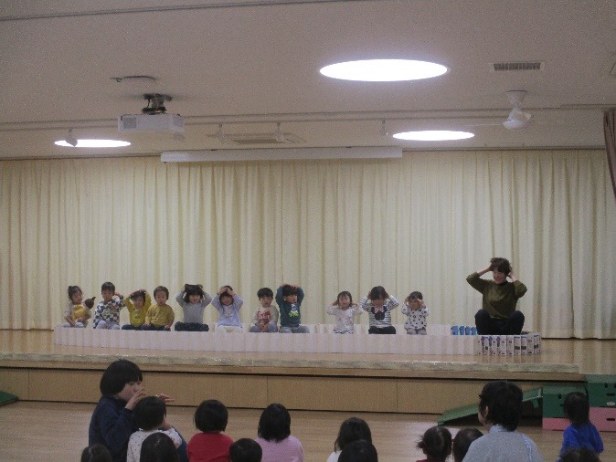 オープニングでは、4クラスが揃って手遊びをします。保育者がパペットを使いながら話しかけることでリラックスして、保育者に注目したり、応えたりする姿が見られています。