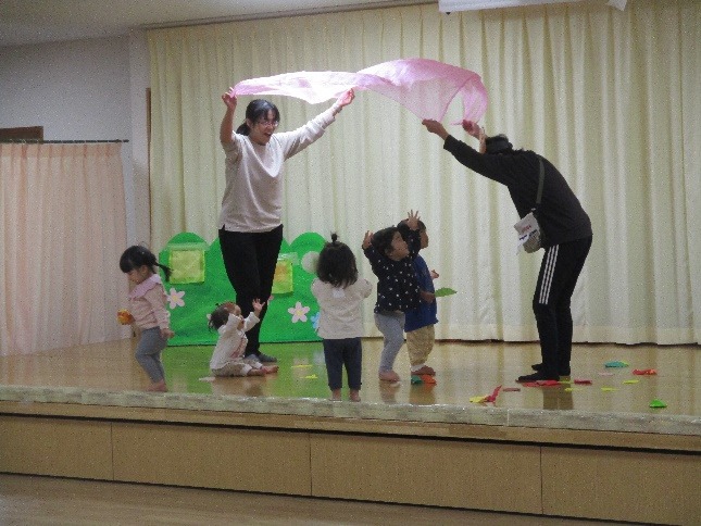 0・1歳児のさくらんぼ組さんは、大きな布を使った遊びが大好き♪保育者がわらべ歌に合わせて布を上下に動かすと、手をのばして喜んだりする姿がかわいらしいです。