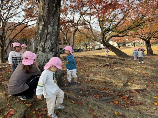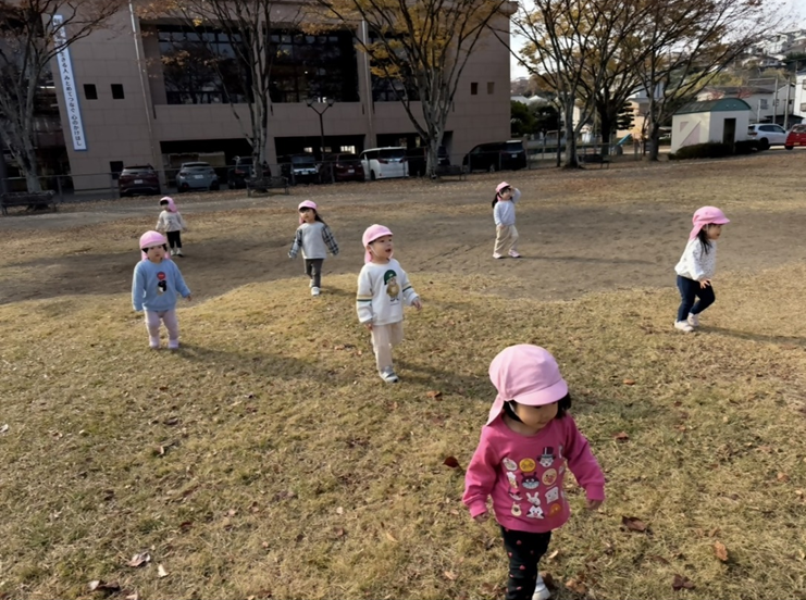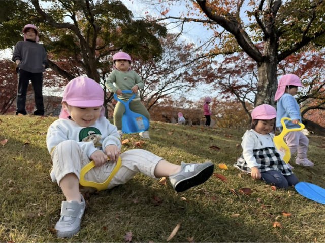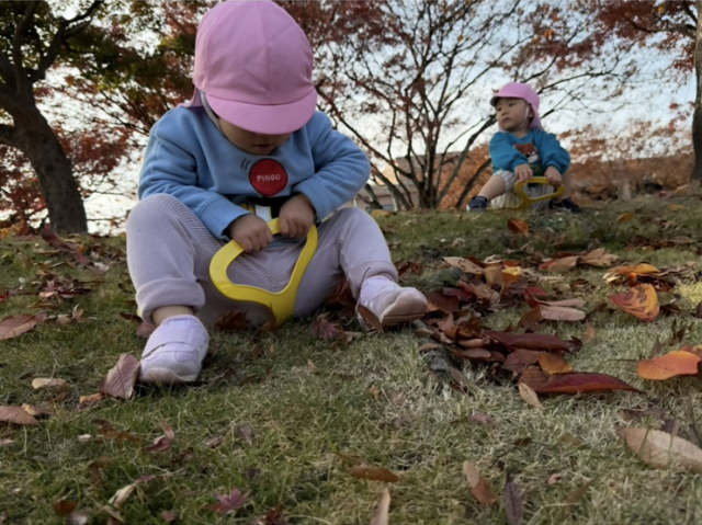 春はみんなそろって散歩車に乗っていたうさぎ組のこどもたち。行き帰りの道も友だちと手をつないで、交代で歩けるようになりました。広い公園で思い切り体を動かしたり、秋の自然に触れたりして、お散歩を満喫しています。