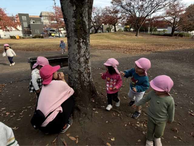 広い公園の中をあちこち歩いて回ります。あれれ?うさぎ組の先生はどこへ行ったのかな?