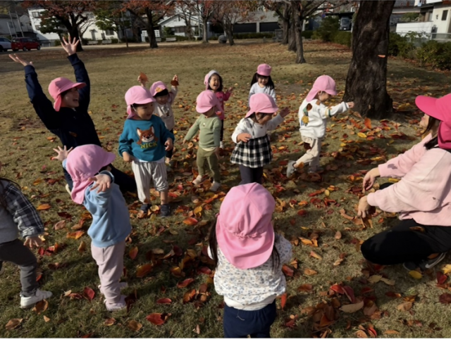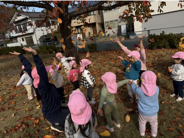 両手いっぱい葉っぱを集めて…「せーの、それー!」葉っぱのシャワーに大喜び★