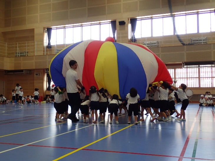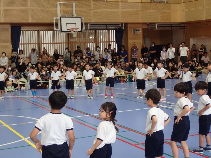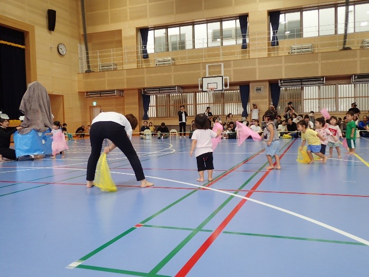 金池小学校のアリーナで、3歳未満児と以上児で2部に分けて運動会をしました。