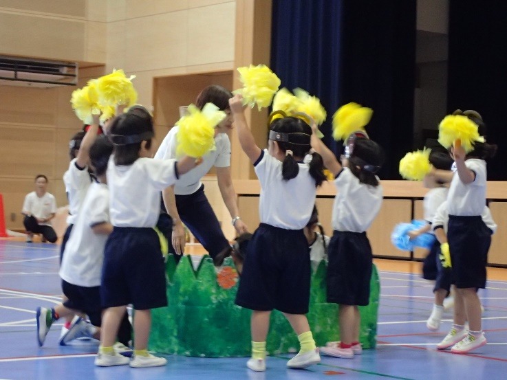 3歳児は、ちょうちょやとんぼ、バッタに変身して野原へお出かけ♪お花が「さいた」 で、草むらのポンポンを取り出してダンスをするこどもたち。音楽に合わせて体を弾ませ、全身で表現していました。