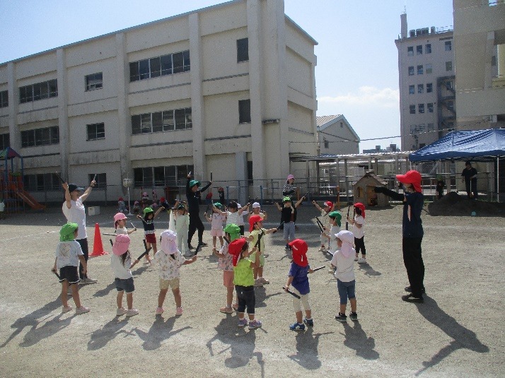 5歳児のバチを使ったリズムはみんなの憧れです。振付をよく覚えていて、かけ声も決まっていました!練習中から5歳児さんの様子をよく見ていて「かっこいい」と感じていたんでしょうね。