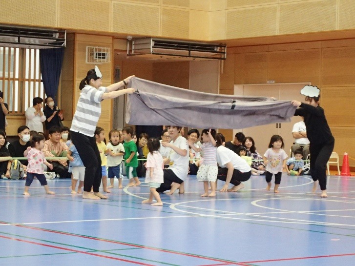 1・2歳児のこどもたちは、雲(大布)が出てくると大喜び♪一度隠してもらっての「いないいないばあ」が大好きです。