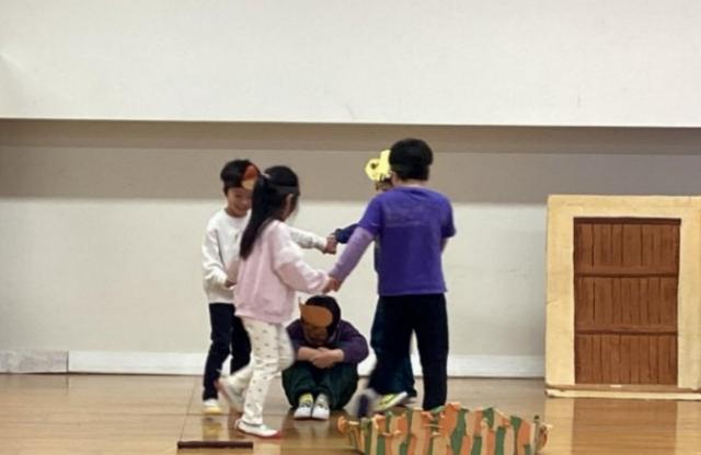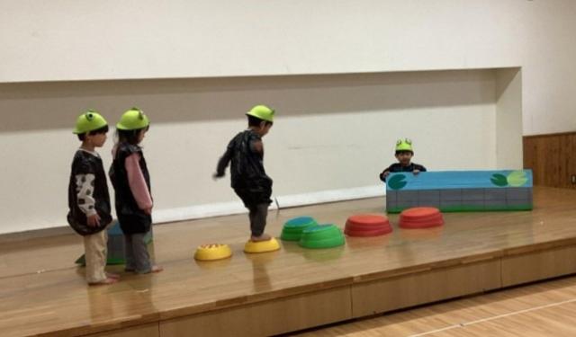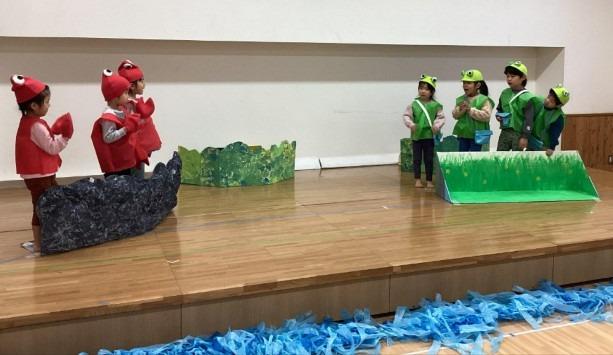 きりんぐみ(3、4歳児)は「10ぴきのかえる」。かえるやざりがになどそれぞれのダンスがとてもかわいいかったり、みんな役になりきってやりとりして楽しみました。