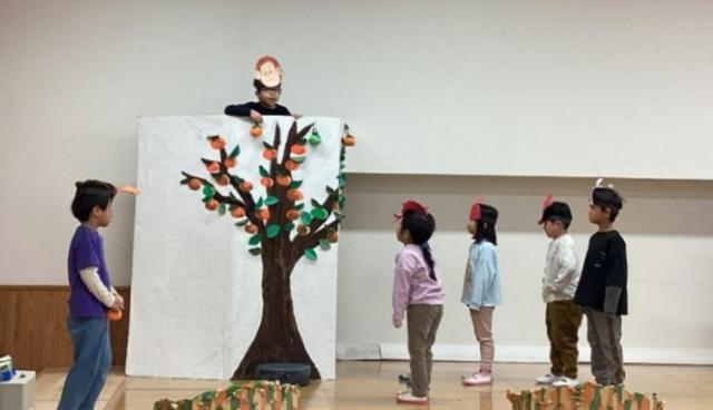 らいおんぐみ(4、5歳児)は「さるかに」のお話。日頃遊んでいるわらべうた遊びも取り入れました。登場人物の気持ちを考えたり、友だちの頑張る姿を見合ったりしながら、みんなで作り上げてきました。