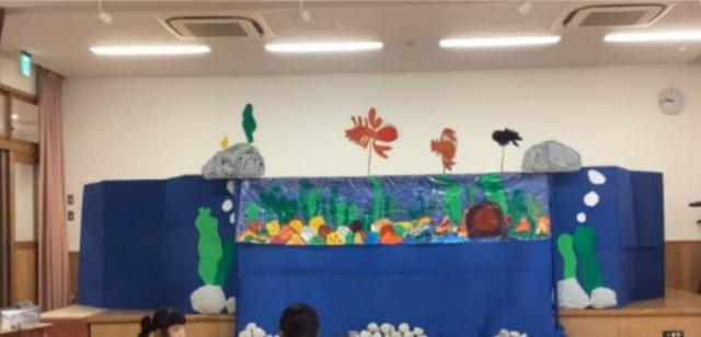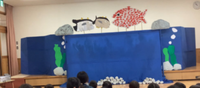 5歳児は自分たちで作ったペープサートで「スイミー」のお話をしました。ペープサートを揺らしながらセリフを言ったり、曲に合わせて動かしてみたり、ペープサートで表現する楽しさを経験できたこどもたちでした。