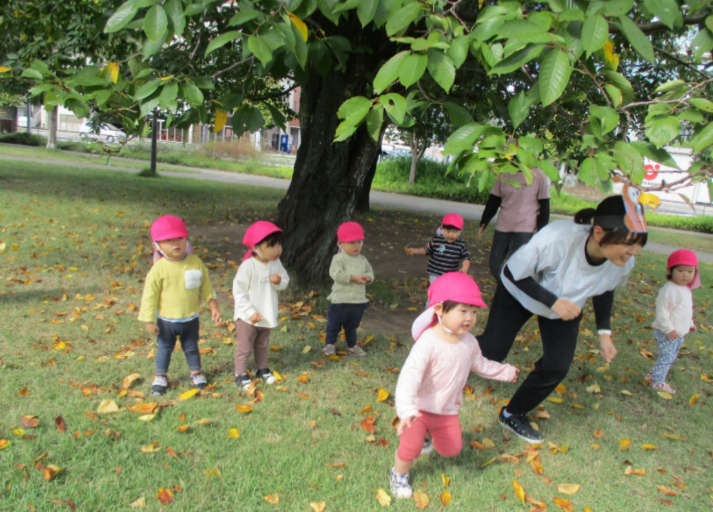 斜面ののぼりおりをくりかえししたり、色とりどりの落ち葉や松ぼっくりを見つけ、大喜び。