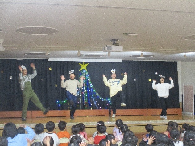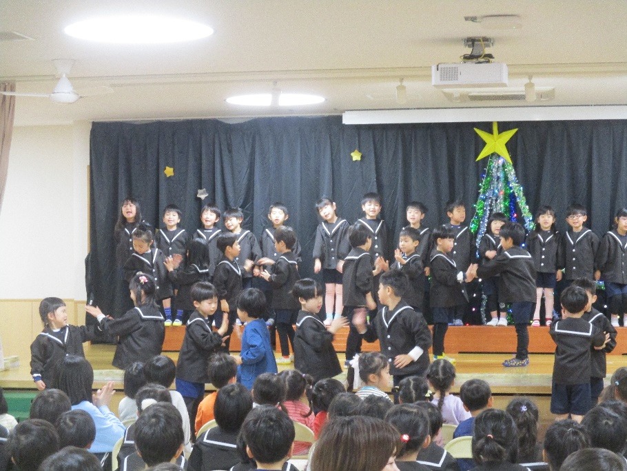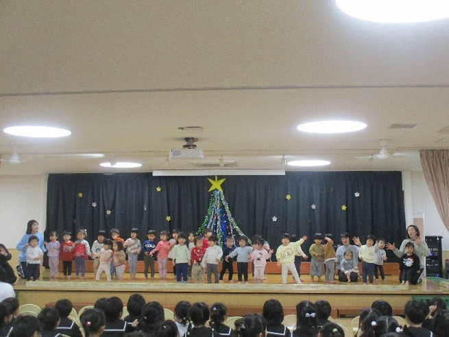 5歳児が、静かな雰囲気の中でキャンドルサービスをした後には、各クラスや学年からの歌やダンスなどを見合うお楽しみ会♪楽しい雰囲気の中、こどもたちもいきいきと表現しています。