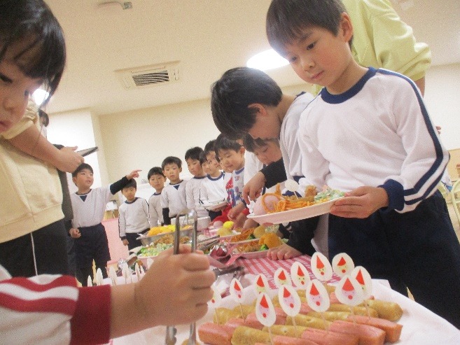 この日の給食は、みんなが好きなからあげ、スパゲッティ、ポテトなどのスペシャルメニューです♪4,5歳児はバイキング形式で、自分でごちそうを取り分けることで、より特別感を味わえたようでした。