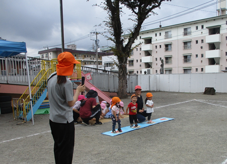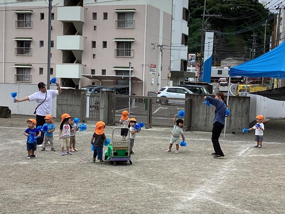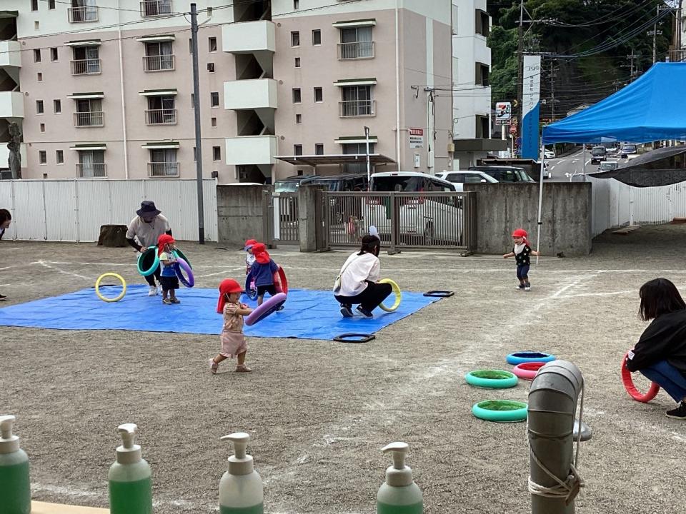 大きいクラスのこどもたちが運動会の活動をしている姿を見て、小さいクラスのこどもたちも楽しそうな雰囲気を感じているようです。保育者と一緒に園庭で好きな遊びをしたり、リズムに合わせて体を動かしたりして、のびのび体を動かして遊んでいます。