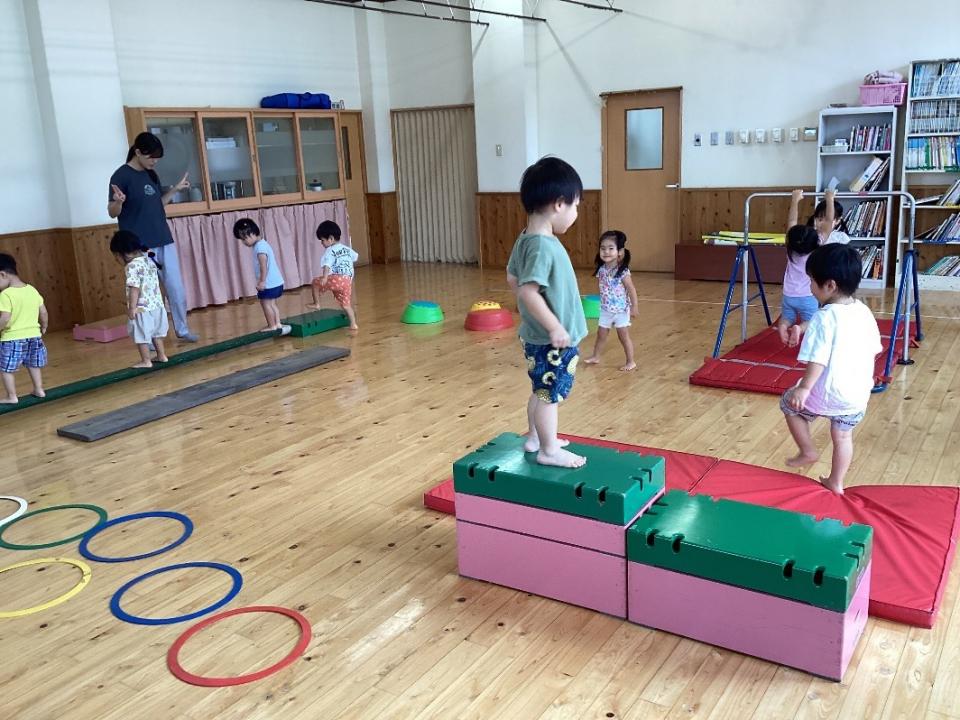 鉄棒にぶら下がったり、細い橋を渡ったり、巧技台からジャンプしたり…力をぎゅっと入れたりバランスをとったりして自分の体をコントロールしながら遊ぶことを楽しんでいます。橋を渡りきった後の満足顔がとっても可愛らしいです。